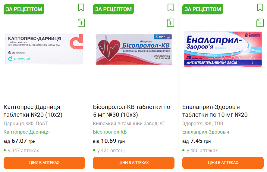 Препарати для зниження артеріального тиску такі як Каптоприл, Каптопрес, Бісопролол, Еналаприл, Амлодипін, Ліпразид, Трипліксам, Амлодипін продаються за рецептом.