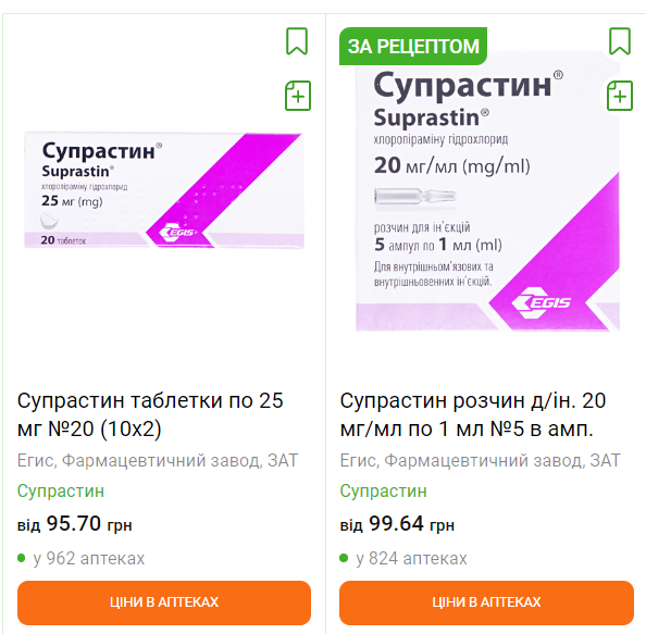 Супрастин в ампулах продаватимуть за рецептом, у таблетках – без (скриншот tabletki.ua)