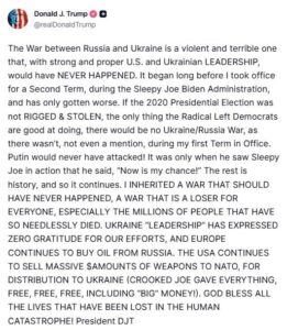 «Війна між росією та Україною — це жорстока та жахлива війна, яка за сильного і правильного керівництва США та України ніколи не почалася б.